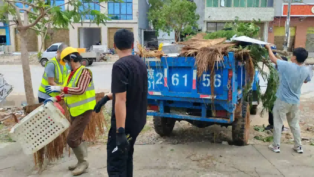 台风过境后,道路两旁树木倒伏和垃圾堆积,路旁围挡倒塌、移位,阻塞交通,为及时打通应急抢险车辆通道,志愿服务队充分发挥“一名党员就是一面旗帜”的先锋模范作用,第一时间投入到紧张的抢险工作中,及时清除海南疍家博物馆周边道路障碍。
