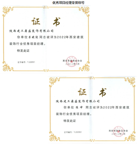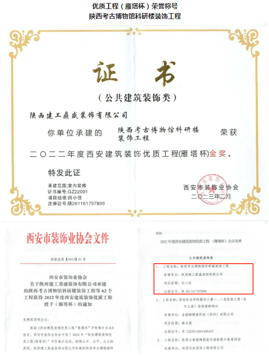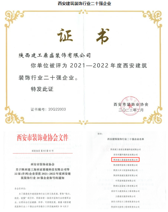在西安市装饰业协会的评审下,鼎盛装饰公司荣获2021-2022年度西安建筑装饰行业二十强企业、先进企业荣誉称号,获得一项优质工程雁塔杯荣誉称号(公司承建的陕西考古博物馆科研楼装饰工程),获得两项优秀项目经理荣誉称号。