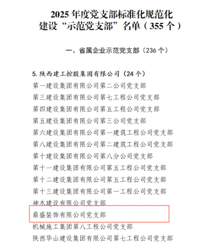 近日,陕西省国资委2025年度标准化规范化建设“示范党支部”评选结果揭晓,陕西建工鼎盛装饰有限公司党支部获此殊荣。这是对鼎盛装饰公司党建工作成效的高度肯定,标志着公司党支部标准化、规范化建设迈上了新台阶。