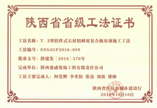 鼎盛装饰公司编写的“T\Z型挂件式石材铝蜂窝复合板吊顶施工工法”荣获“陕西省省级工法”荣誉称号