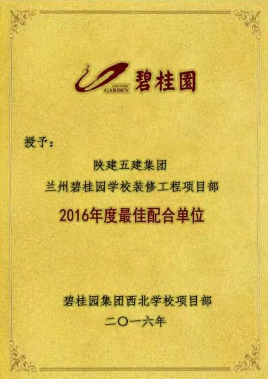2017年1月16日,陕建五建集团兰州碧桂园学校装修工程项目部被甲方碧桂园西北学校项目部授予“2016年度最佳配合单位”荣誉称号。该荣誉是甲方授予建设单位在2016年度各项工作综合考评的最佳评价。