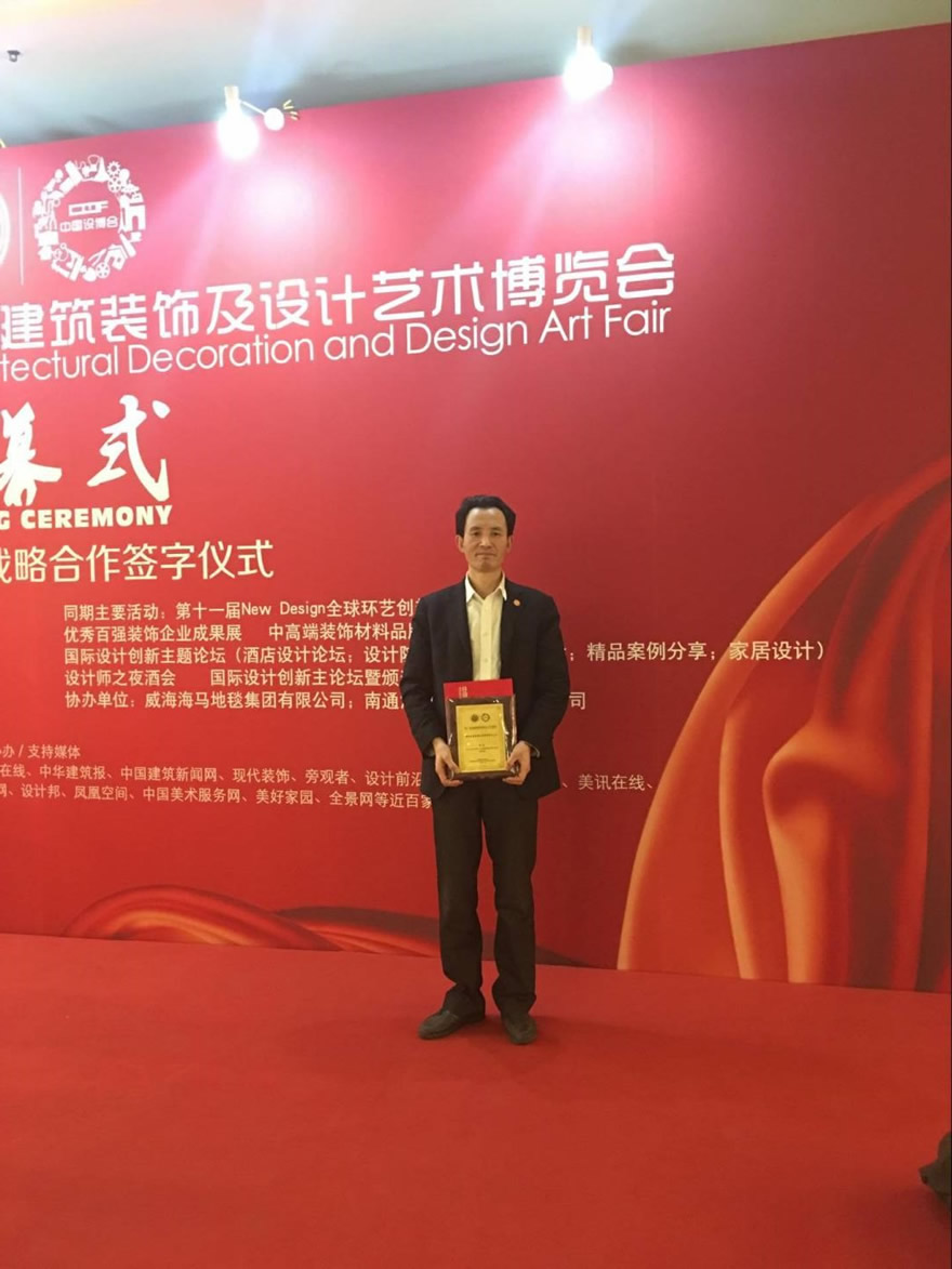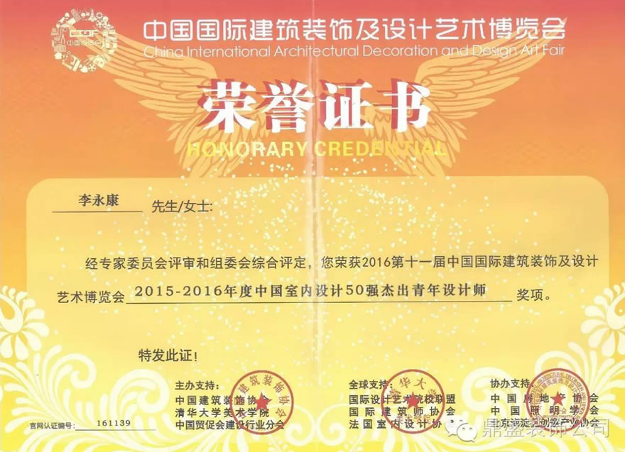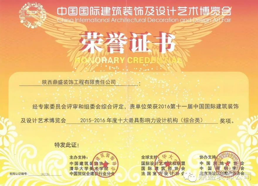 近日,第十一届中国国际建筑装饰及设计艺术博览会在北京国际会议中心召开。陕西建工鼎盛装饰有限公司设计部荣获“2015—2016年度十大最具影响力设计机构(综合类)”荣誉称号,公司设计部李永康荣获“2015—2016年度中国室内设计50强杰出青年设计师”荣誉称号。