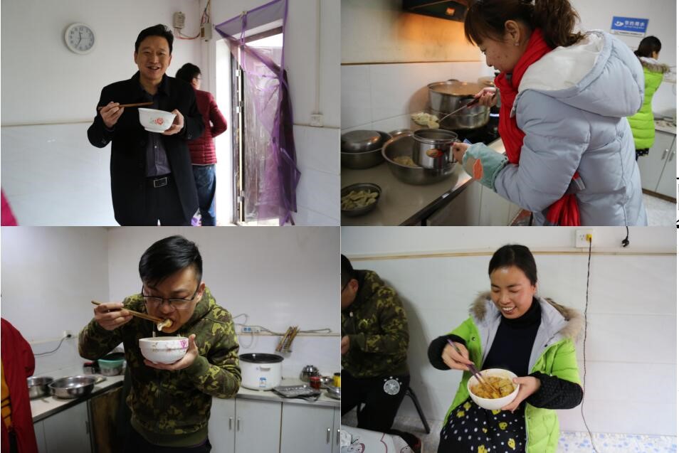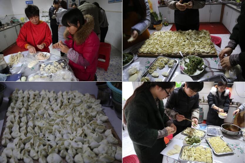 今天窗外寒气逼人,但同事们还是乐在其中,为了让大家按时吃上热乎乎的水饺,六七名女同志围坐在一起双手上下舞动,相互比赛着看谁包的快。午餐时间,一盘盘的热气腾腾的饺子端上桌时,同志们开心的吃着水饺,猜测着吃着谁包的饺子,其乐融融。虽然大家包的饺子外形可能并不算漂亮,味道并不算顶尖,但是,洋溢在我们心里的是满满的幸福和满足,我们不仅是同事更是家人。